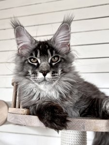 Крупный с мощными лапами котик. Прекрасная шубка. Высокие уши с пушистыми кисточками. Ласковый и игривый.